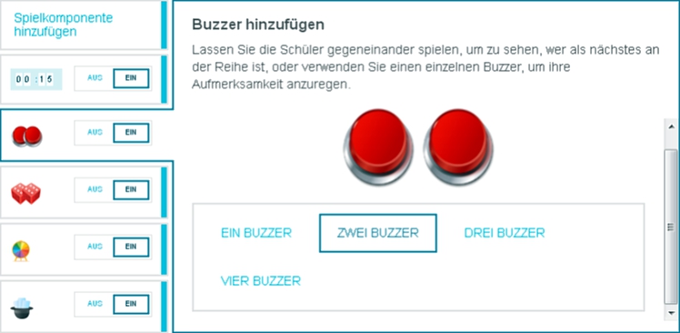 Bis zu vier Schüler können gegeneinander spielen, um zu sehen, wer als nächstes an der Reihe ist, oder verwenden Sie einen einzelnen Buzzer, um ihre Aufmerksamkeit anzuregen.
